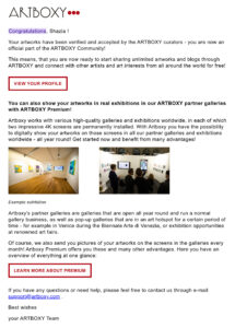 My artwork has been accepted for exhibition in galleries digitally on 55″ screens worldwide in Italy, Germany, Switzerland, Miami, Dubai, Spain and Greece! For more
