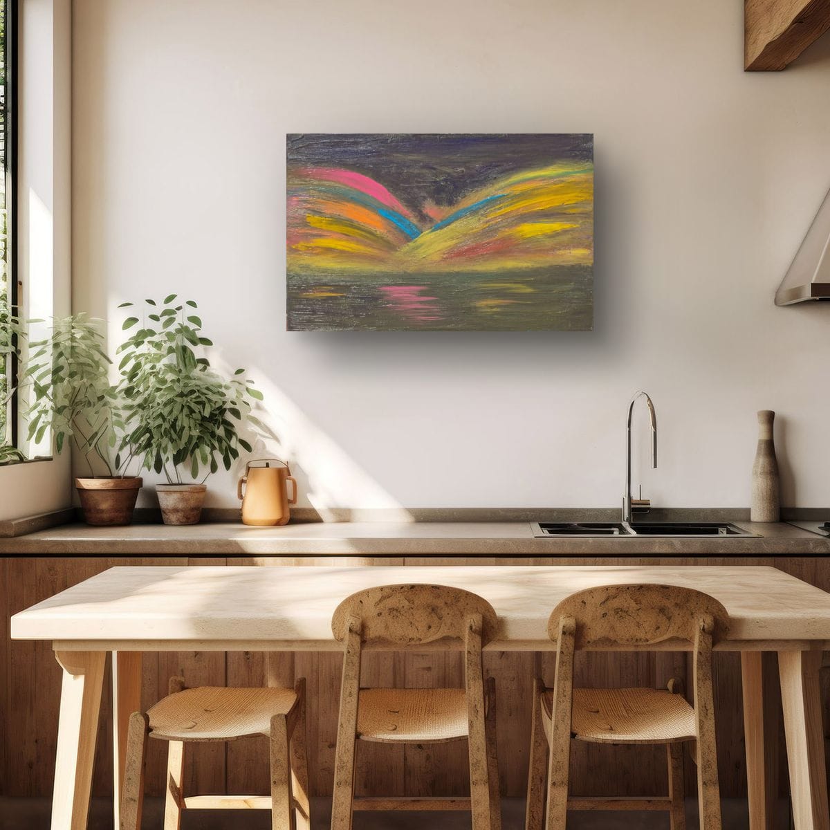 Awakening Sky captures the moment when the horizon comes alive with colour and motion. Expressive strokes of pink, gold, and blue rise through a shifting sky, reflecting the meeting of stillness and energy. The painting speaks of renewal, hope, and the quiet joy of light returning after darkness — a celebration of nature’s rhythm and creative rebirth.