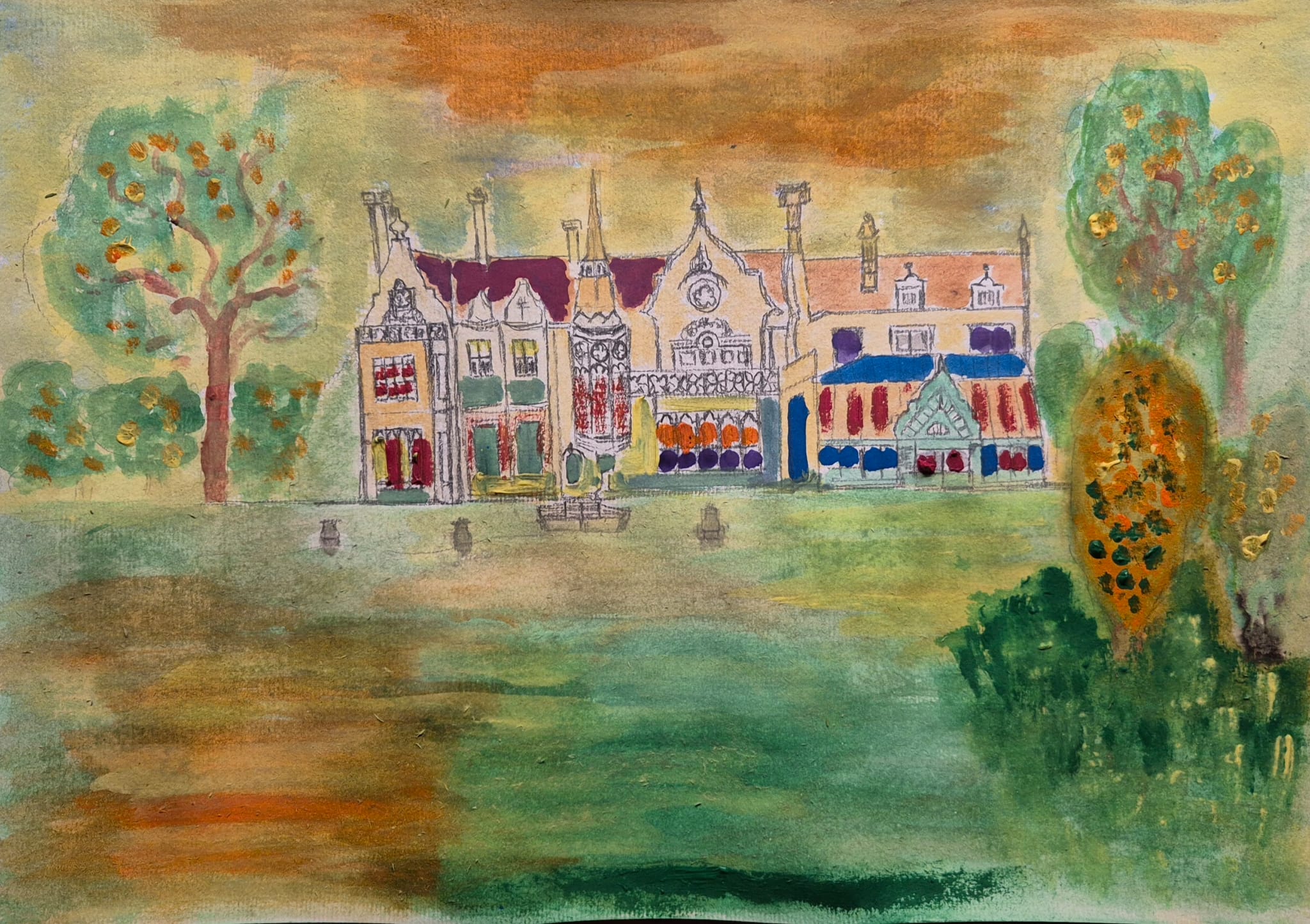 This watercolour celebrates the beauty of change — where sunlight softens, leaves shimmer with warmth, and heritage meets the serenity of nature in perfect balance.