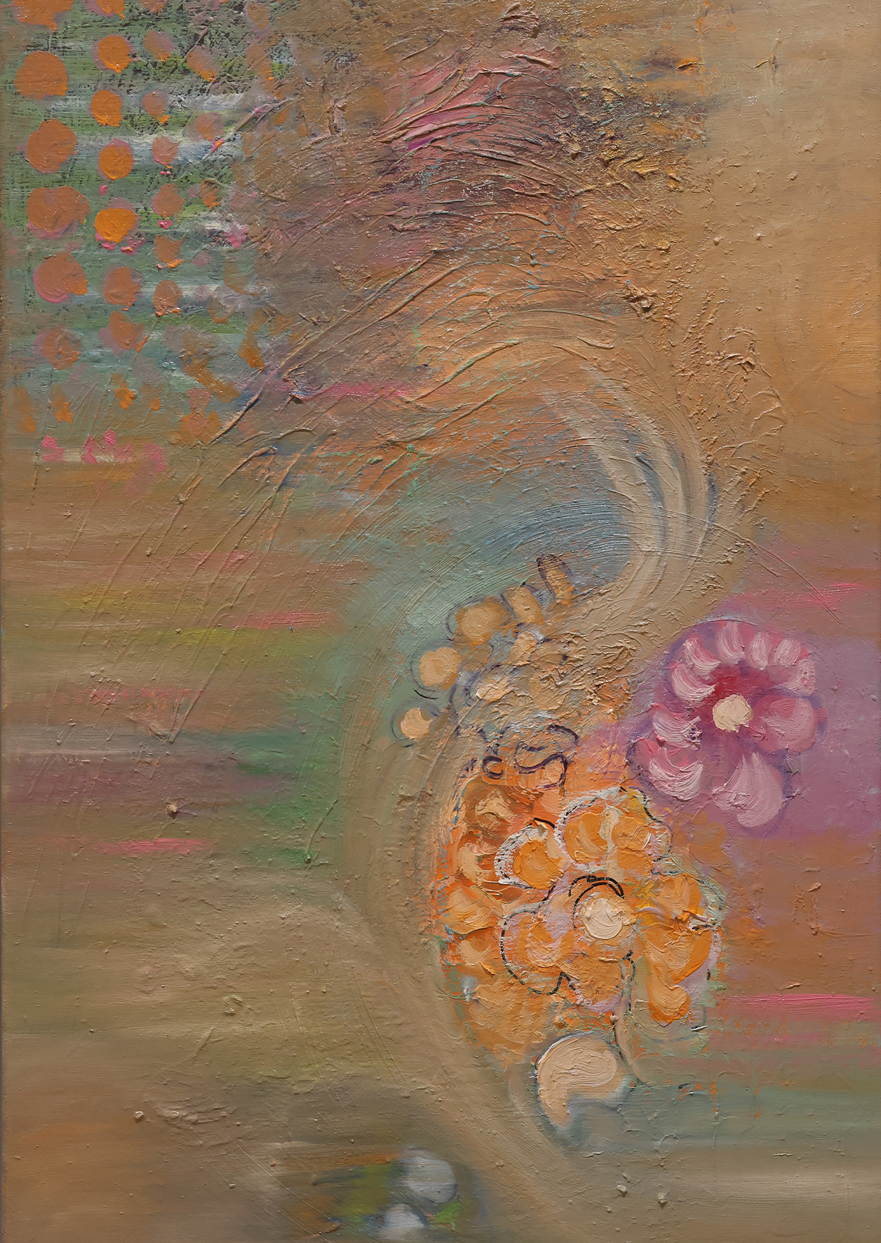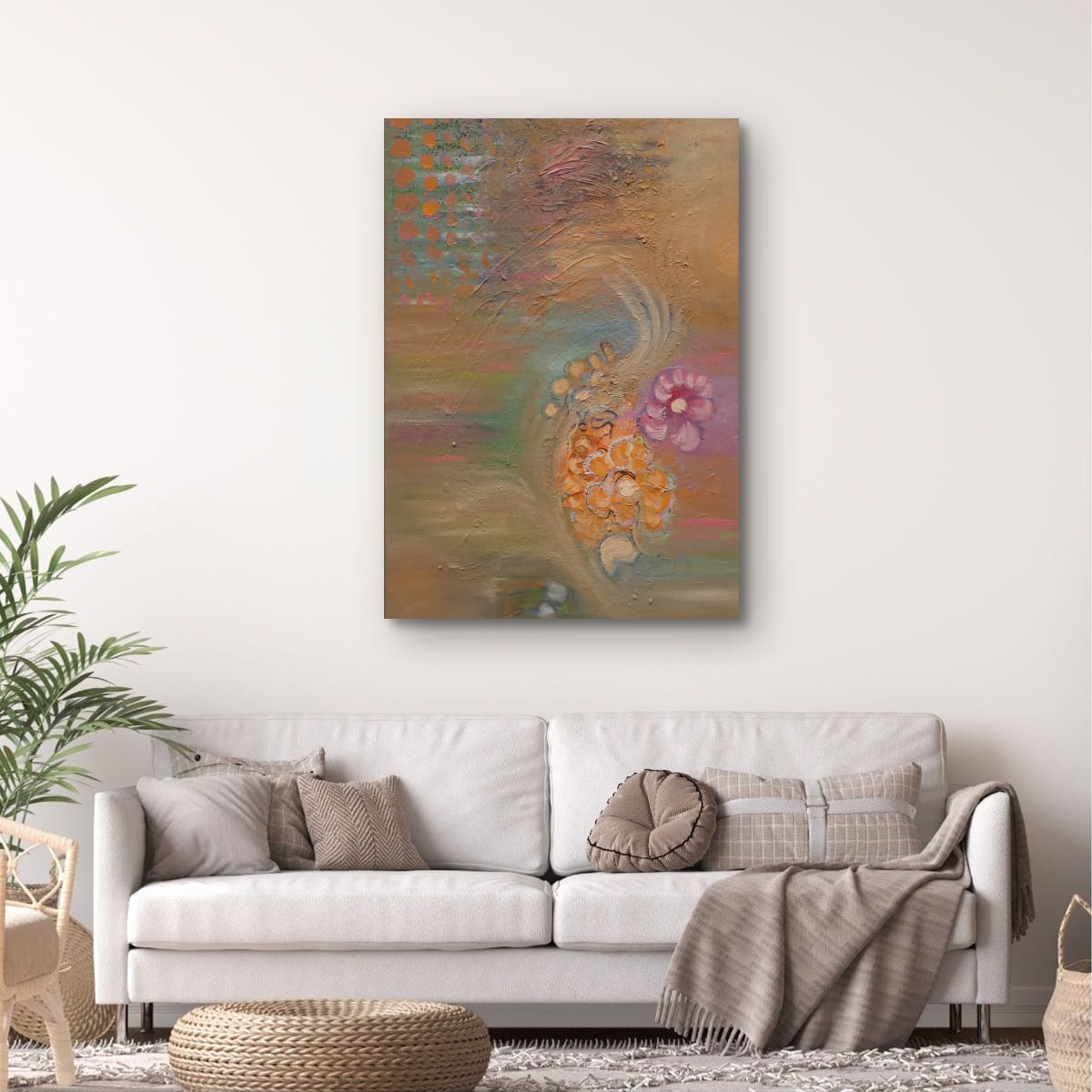 A quiet swirl of movement unfolds through layered textures and softened tones, where colour drifts between stillness and motion. Floral elements emerge gently from the surface, as if carried by an unseen current, creating a sense of flow that feels both grounded and fleeting.