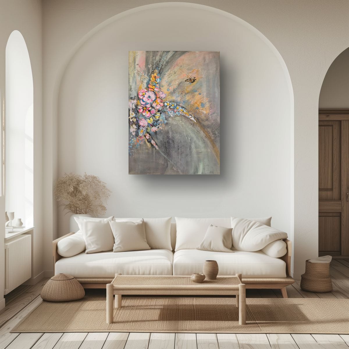 Blending abstraction with semi-realistic florals, this piece evokes serenity, softness, and the subtle beauty of nature in motion. Rich textures and expressive colour transitions make it a calming yet captivating statement artwork for any space.