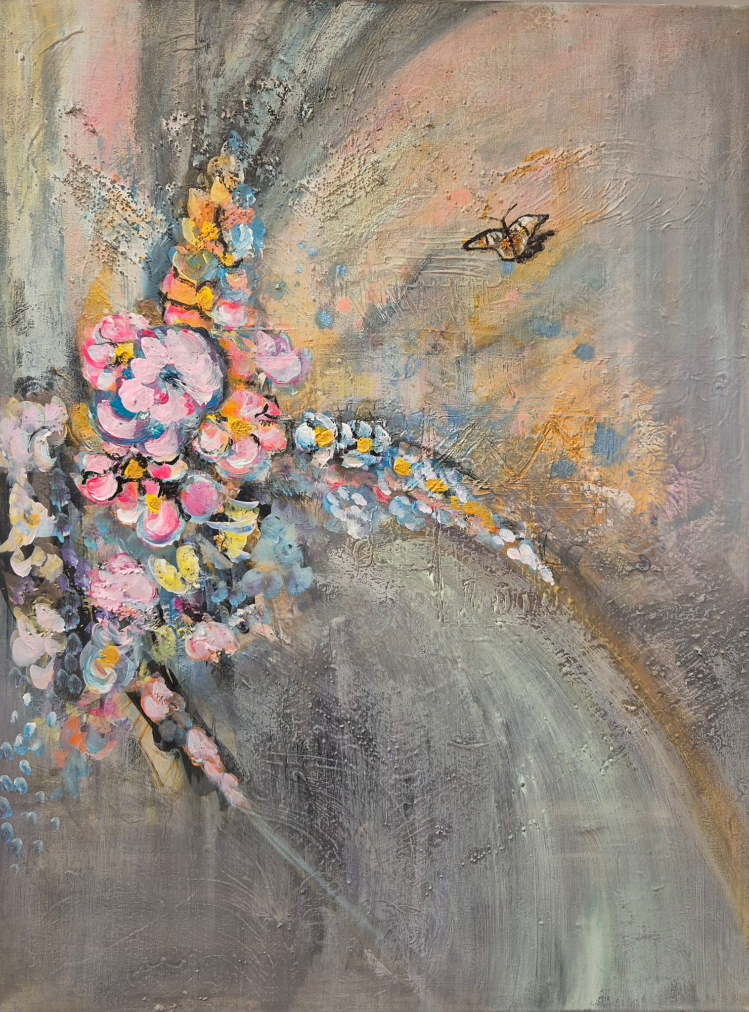 “Where Blossoms Rise” captures a moment of quiet transformation. Soft clusters of blossoms sweep upward through textured layers of grey, blush, and muted gold, creating a sense of gentle movement and renewal. The delicate butterfly drifting toward the light adds a symbolic touch of hope and awakening.