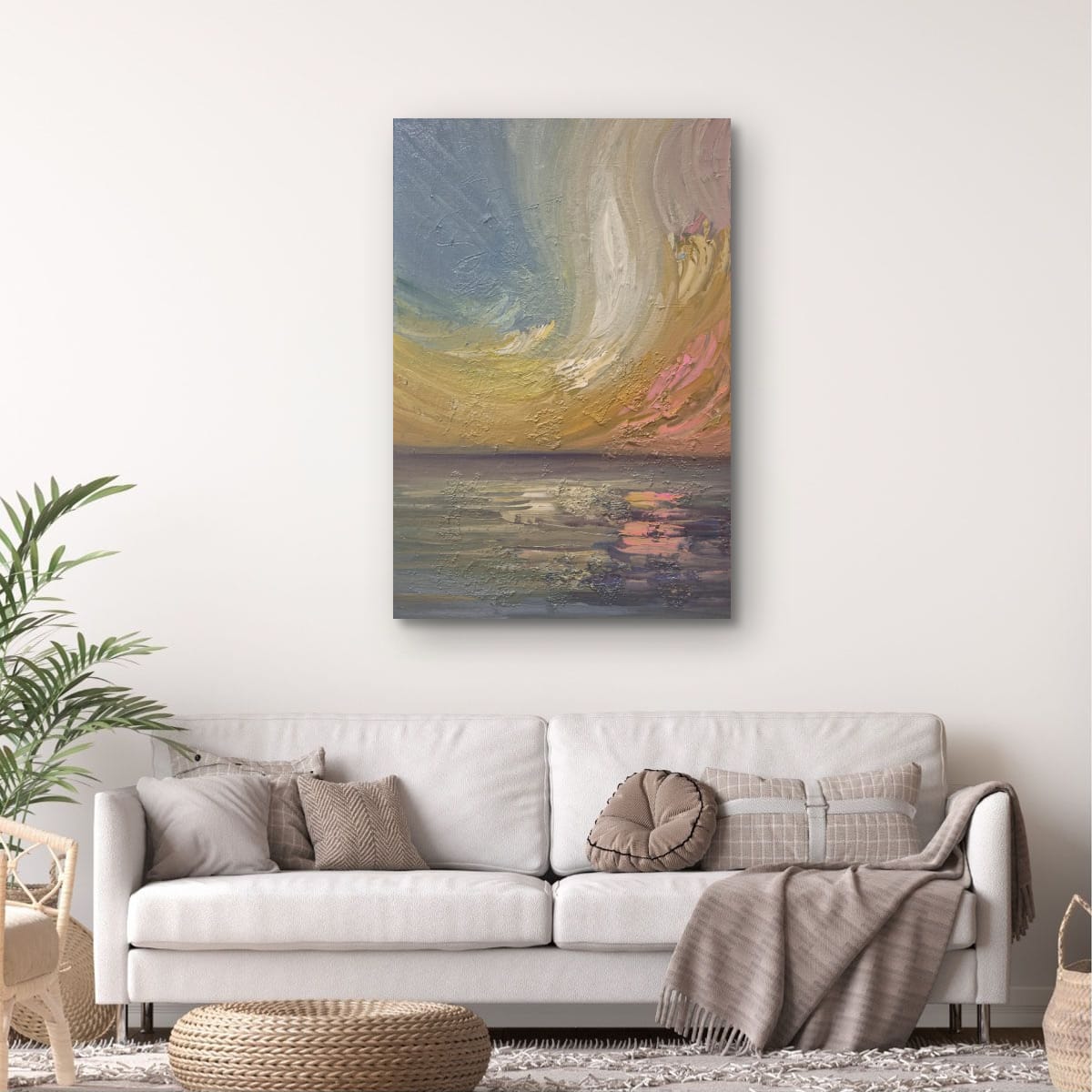 Sweeping movement carries the surface upward, where ocean and sky seem to rise together in a shared surge of light and colour. Layers of soft blue, warm gold, and muted blush create a sense of elevation and release, evoking the moment when tides lift and the horizon loosens. Through expressive brushwork and gentle transitions, the painting explores motion at its most fluid — powerful yet calm, expansive yet held.